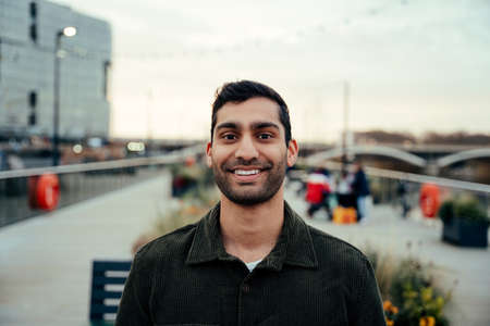 Mixed race male standing on boardwalk smiling enjoying evening walk