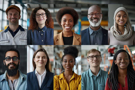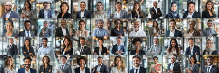 A mosaic collage showcases successful male and female businessmen of diverse ethnicities and ages, smiling confidently at the camera
