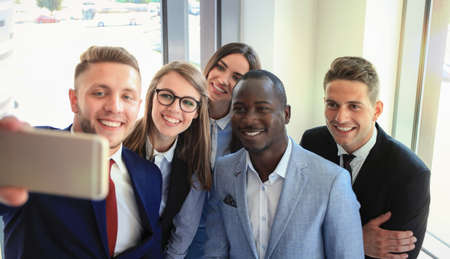 Selfie of group young man and woman team smiling having fun together