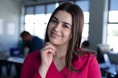Portrait close up of a Caucasian female business creative with shoulder length dark hair working in a casual modern office, standing with her hand under her chin and smiling to camera