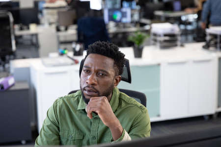 African American businessman working in modern office, sitting at desk looking at computer screen. Social distancing in workplace during Coronavirus Covid 19 pandemic.