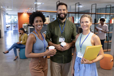 Portrait of happy business people standing in office and smiling at camera