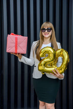 Happy woman with golden air balloons and gift box posing on abstract dark background