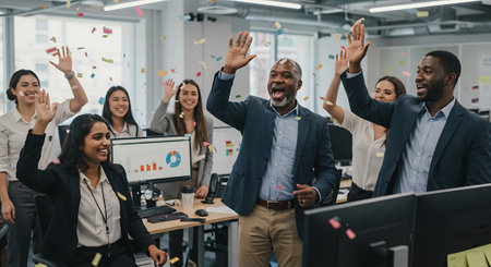 A group of professionals celebrates an achievement in a modern office. Confetti falls as individuals raise their arms, lit by natural daylight. The image showcases a banner with text and the collaborative spirit of the team. Suitable for use in business and editorial content, this image highlights accomplishment.