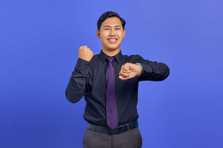 Smiling young handsome businessman checking time on wristwatch and making celebration gesture on purple background