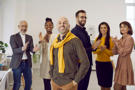 Smiling business team leader. Happy confident successful handsome bald man in casual wear standing hands in pockets, with team of people applauding in background. Recognition at work, success concept