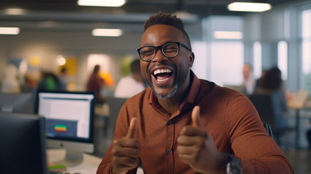 Lucky happy overjoyed male winner clenches fists rejoices triumph at work glad to recieve high profits has own prosperous business Attractive African American man achieve : Generative AI