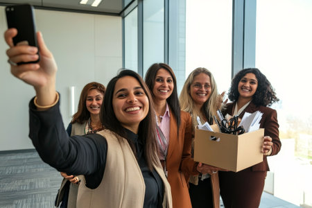 Women are joyfully taking a selfie together in a bright office, holding a box of documents while sharing smiles and camaraderie.