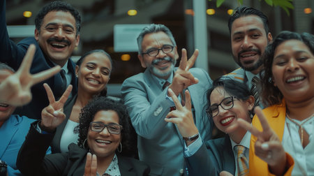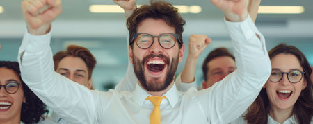 A diverse team of business professionals ecstatically celebrating their success in a modern office, expressing triumph and unity after achieving their goals
