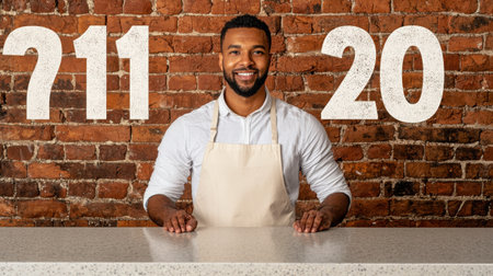 A cheerful barista stands behind a clean countertop with a brick wall backdrop. The numbers add a unique touch to the inviting atmosphere of the cafe.