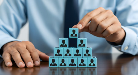A close-up of a businessman’s hands in a suit carefully stacking wooden blocks with people icons into a pyramid structure. This concept image visually represents corporate hierarchy, leadership, teamwork, and human resources management. It is ideal for illustrating themes of team building, recruitment, staff management, organizational planning, and business development. Perfect for use in presentations, HR materials, corporate training, and business strategy content.