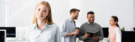 Smiling businesswoman looking at camera while multiethnic colleagues working at background in office, banner