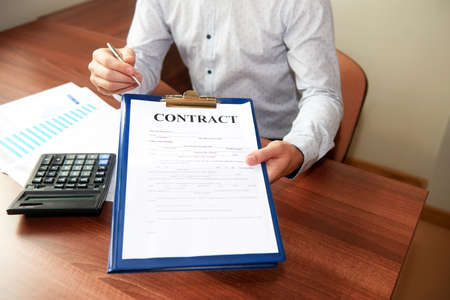 businessman shows a contract. partial focus. close-up