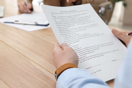 Man reading employment agreement at table in office, closeup. Signing contract