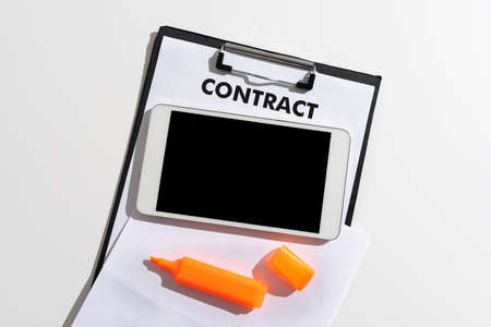 Contract paper and pen on white desk background. Focus on title Contract. Defocused pencil