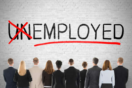 Businesspeople Looking At Unemployed Concept With Crossing Off Letters Un On Brick Wall. Job And Employment Concept