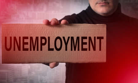 A man holds a sign with the words Unemployment. A person is looking for a job. Unemployed in search of work. Remain without work.