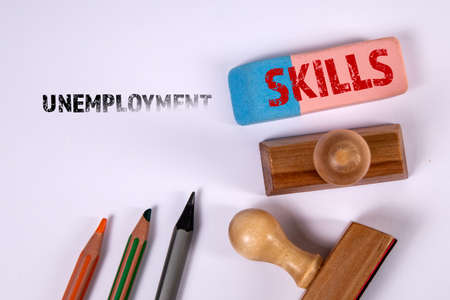 UNEMPLOYMENT and SKILLS concept. Office supplies on a white background