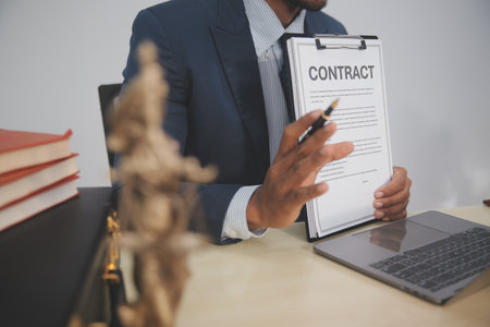 Law consultancy concept A male prosecutor reviewing his sentences of contract on his own notebook before writing them down on the contract paper
