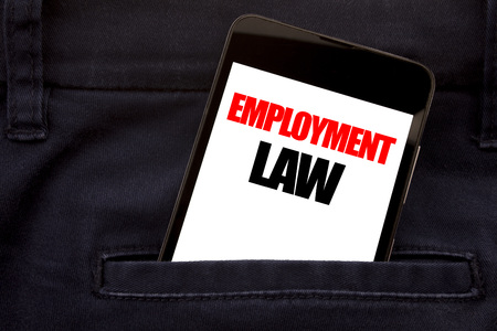 Word, writing Employment Law. Business concept for Employee Legal Justice Written phone mobile phone, cellphone placed in man front jeans pocket.