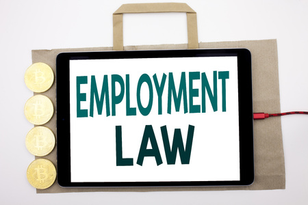 Handwritten text showing Employment Law. Business concept writing for Employee Legal Justice Written on shopping bag and tablet white background, tablet charging with cryptocurrency bitcoin.