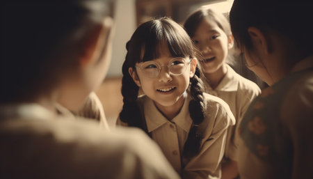Generative AI : Happy children girls girlfriend schoolgirl student elementary school