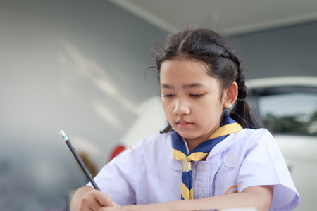 Little Asian girl in Thai student uniform doing homework with concentration, select focus shallow depth of field