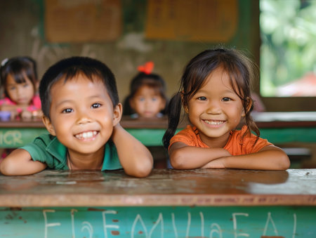 Two Asian cheerful children smiling brightly in a colorful classroom, surrounded by their classmates, highlighting joy and enthusiasm in learning.