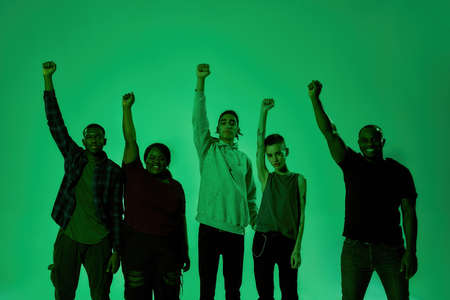 Young multiracial people standing with raised hand