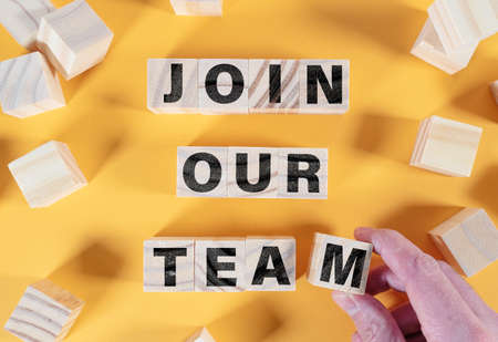 directly above view of text JOIN OUR TEAM on wooden blocks against orange background