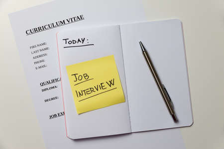 Curriculum vitae and notebook with yellow ticket and text today job interview. Job search and job interviews.