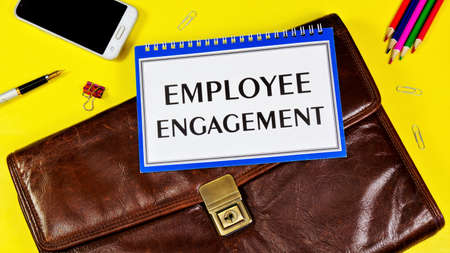 Employee engagement - a text label in a folder on the office briefcase. Motivation to do a better job. Career success in the team.