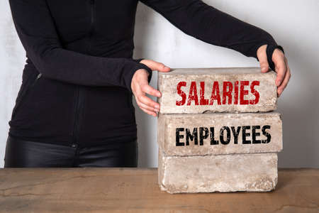 Employees and Salaries concept. Woman builds a pile of bricks on a wooden table
