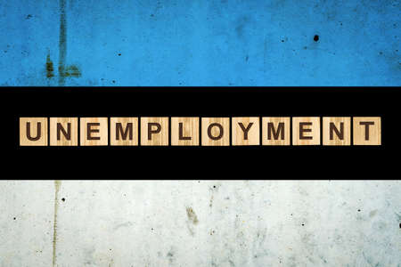 Unemployment. The inscription on wooden blocks on the background of the Estonia flag. Unemployment growth. Business. Job.