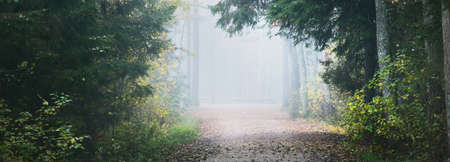 dusk misty forest landscape autumn season nature view with high trees and lonely orange trail foot path