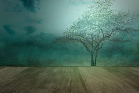 Wooden floor in the forest with smoke and fog with night scene background. Halloween concept
