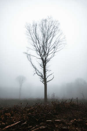 Leafless lifeless tree alone isolated in a desolated destroyed forest in fog