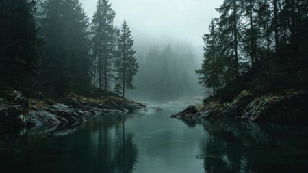 A beautiful shot of a thick forest in fog with pine trees and white space for text