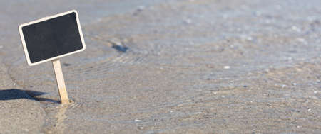 panoramic wide banner. blank vintage wooden sign board hanging on glass door in modern cafe restaurant, copy space for text advertising, advertisement marketing and small business owner concept