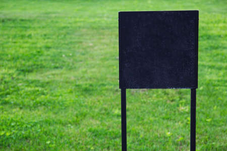 Closeup black metal sign at green grass background, nameplate with a space for your text, copyspace, empty space for inscription