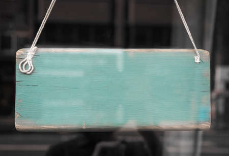 Blank sign hanging by rope on antique rustic wooden background empty paper with copy space. Free Space.