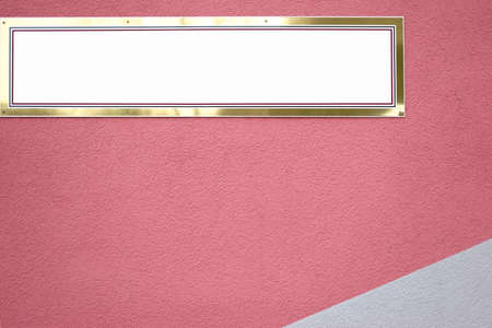 An empty sign with a gold frame on a two-tone modern facade of a building.