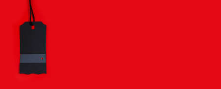 Blank price tags made of red paper or gift tags on a black background banner. Blank price tag with cord. Black friday. Sale tag. Super sale.