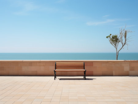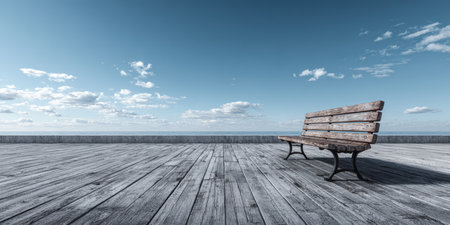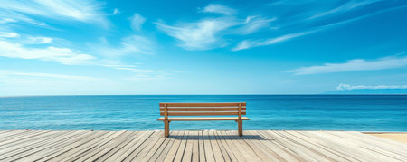Wooden bench on a pier overlooking the ocean on a clear day, tranquil seascape. Relaxation and serenity concept