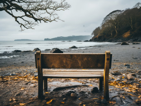 Bench by the sea on a tranquil beach, no one in sight, with soft waves and a calm horizon creating a peaceful atmosphere.