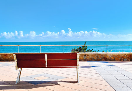 Serene view of bench overlooking blue Mediterranean Sea and horizon under bright, clear sky, radiating tranquility and relaxation. Travel concept. Torre de la Horadada town, Costa Blanca, Spain