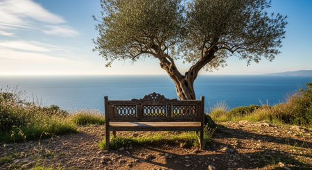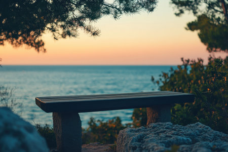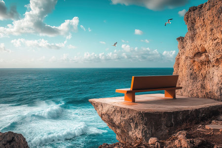 AI Generated. Serene wooden bench by dramatic seaside cliff at sunset
