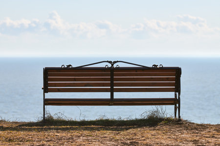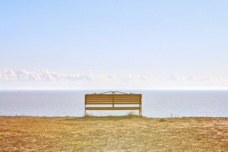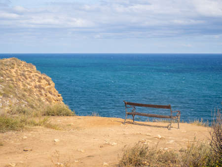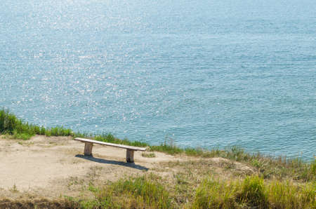 Empty bench on cliff before sea background, peaceful and quiet place for thinking alone, loneliness and loss of loved one concept. Pacifying view of marine horizon of Azov sea in Russia