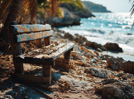 Scenic wooden bench on the beach with ocean waves gently crashing in the background