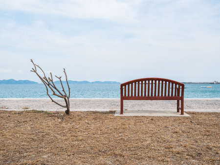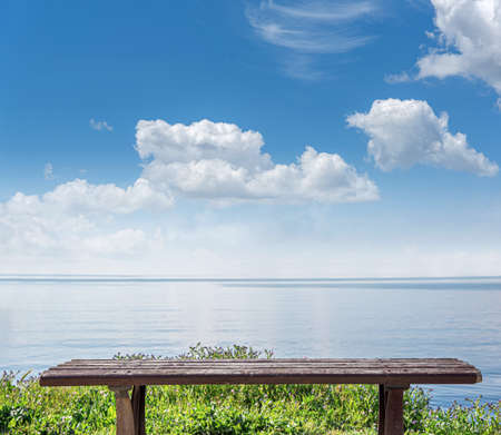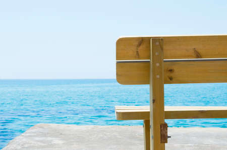 Wooden bench on the shore of the blue sea, lake on a summer sunny day